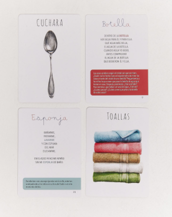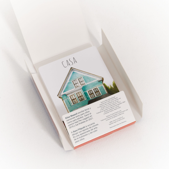 Tenemos una baraja de 32 cartas, de las cuales 28 son COSAS que pertenecen o te puedes encontrar en las otras 4 cartas, que son estancias de la CASA. En el reverso de cada carta hay canciones y rimas relacionadas con el objeto o el lugar de la casa. También encontrarás una aclaración o propuesta para utilizar la carta con los peques.