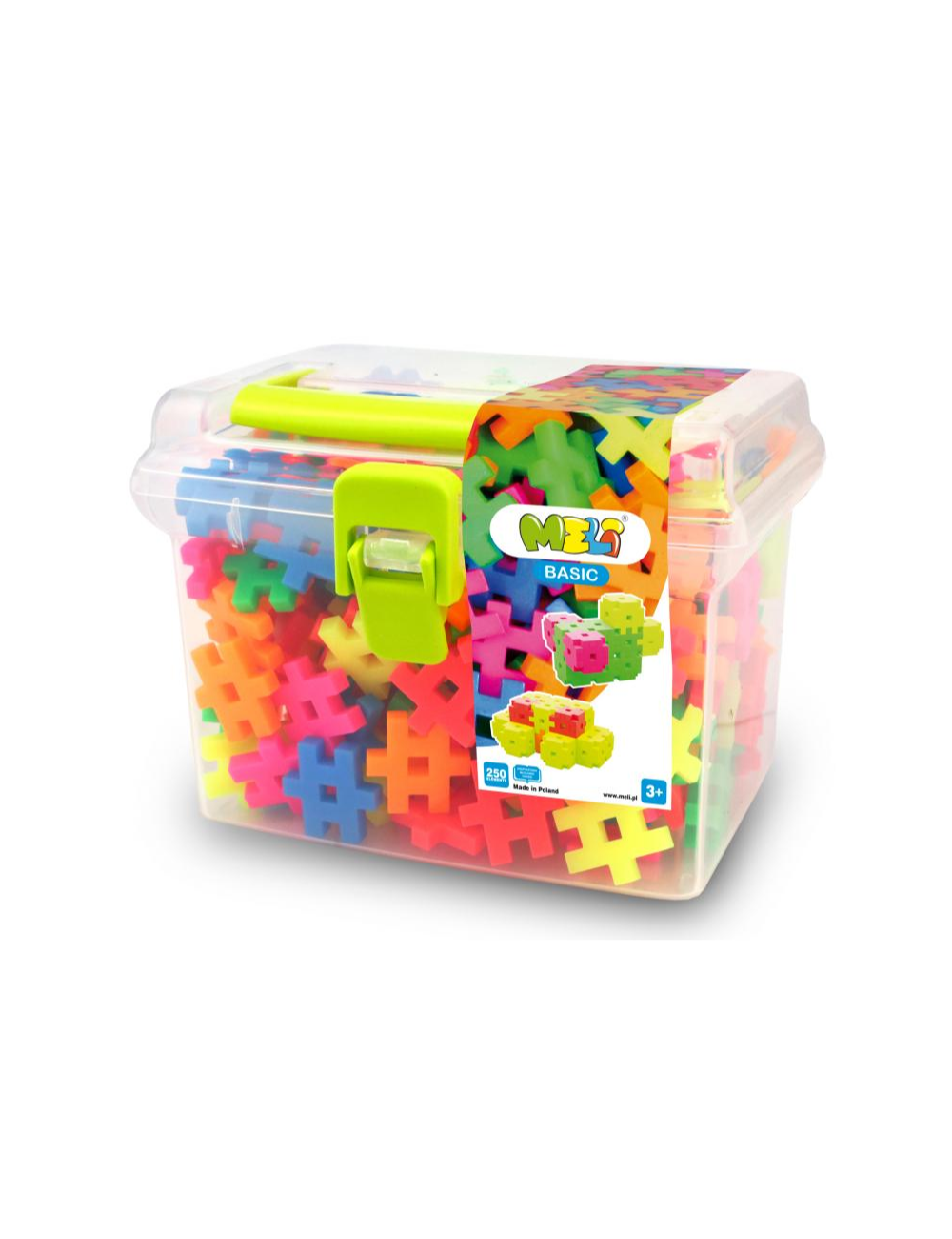 Descubra el placer de la creación con el set MELI BASIC Neon Travel Box 250 piezas, idea para transportar a cualquier lugar, vienen en un baúl de plástico transparente con asas.