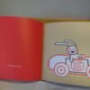 El fondo de las páginas va cambiando de color: rojo, marrón y blanco. En las hojas de marrón kraft, aparecen las preguntas sobre la caja, sobre el fondo rojo la respuesta de Conejo “No es una caja”, cada vez un poco más enfadado. En las páginas con fondo blanco la ilustración en la que se superponen los dibujos de la caja y la utilidad que le da el protagonista.