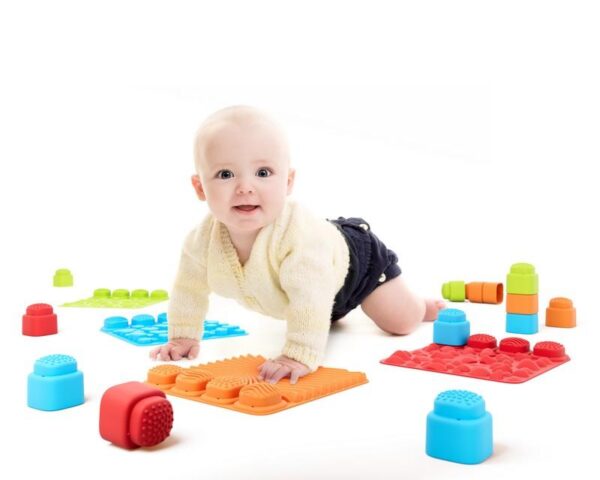 Incluye: 4 alfombrillas de colores, 16 bloques sensoriales